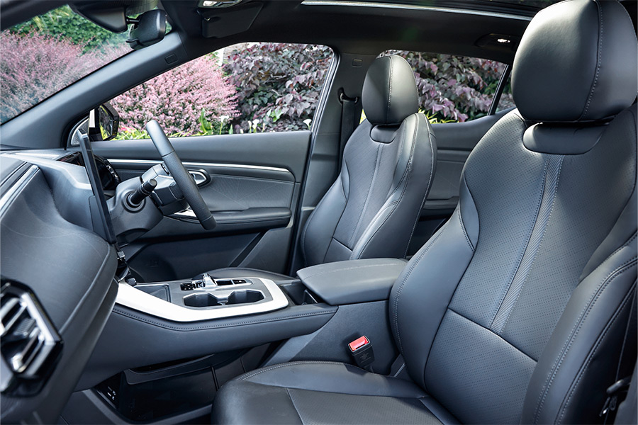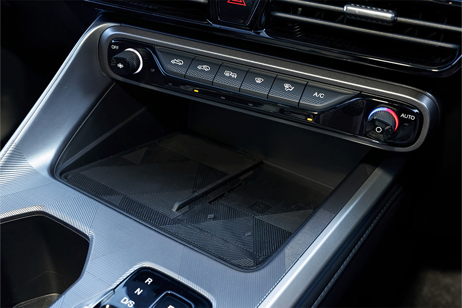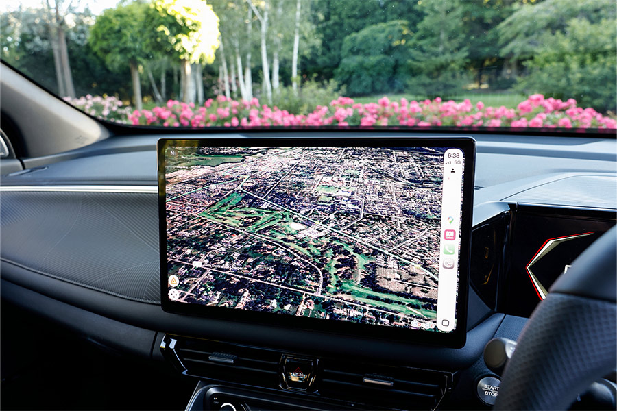 Dual screens – measuring 14.6 inches for the centre one and 7.0 inches for the driver’s – provide crisp display. Wireless Android Auto and Apple CarPlay come standard, with a 50-watt wireless charging pad, USB-A and -C ports up front with one -A port in the rear.