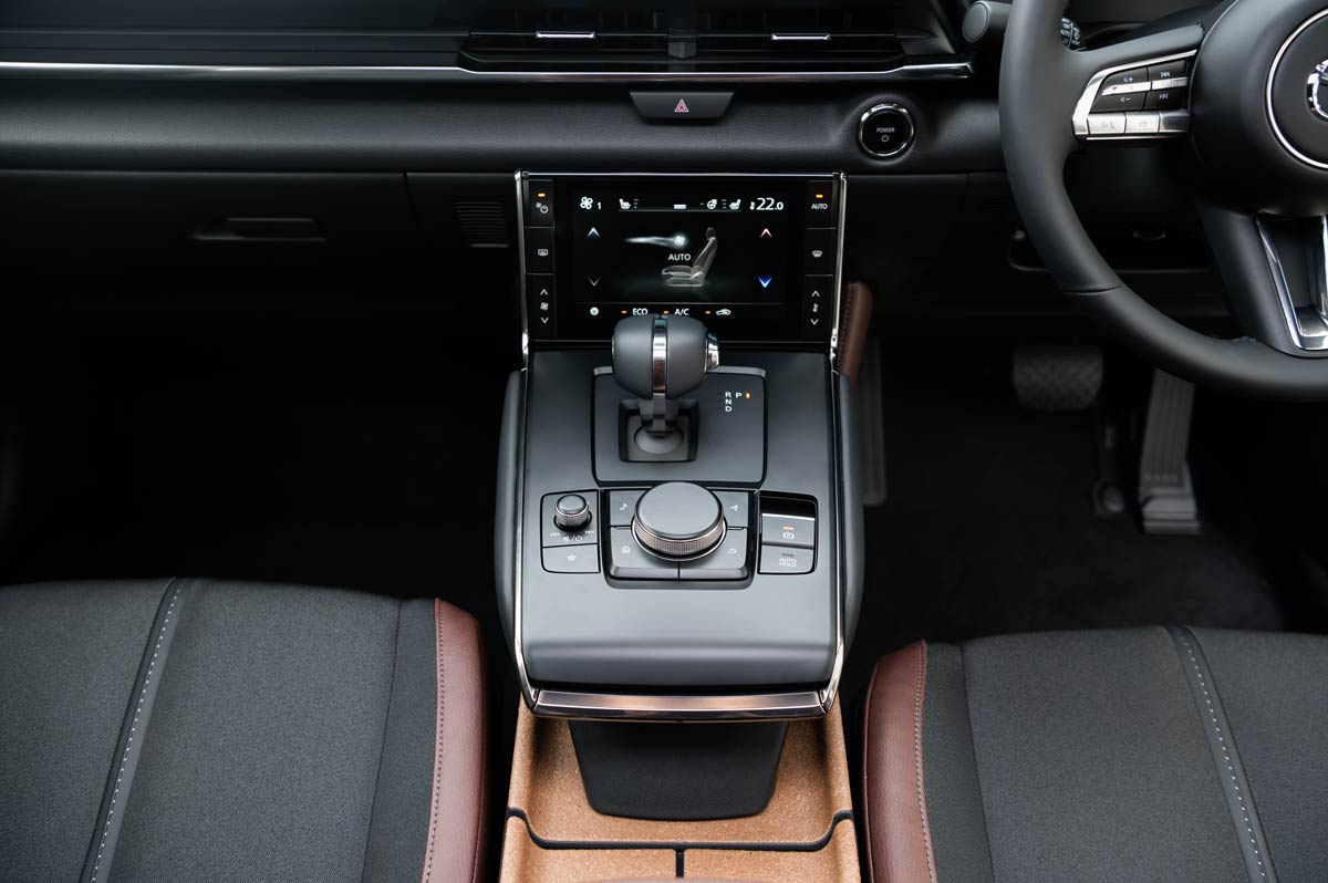 The underfloor space in the cargo area is at capacity with a jack and a puncture repair kit, so Mazda has resorted to storing the EV charging cables in two material bags strapped to the wheel arch – far from ideal or presentable.