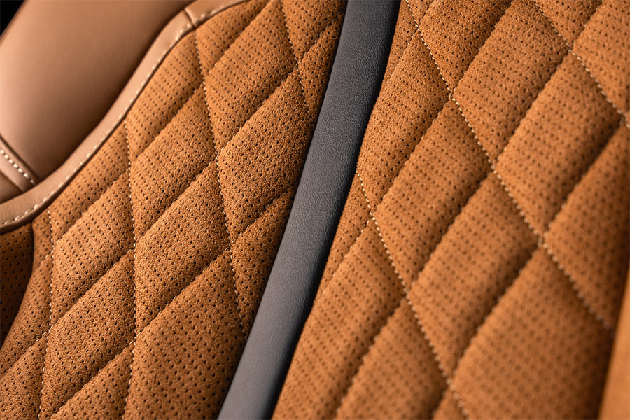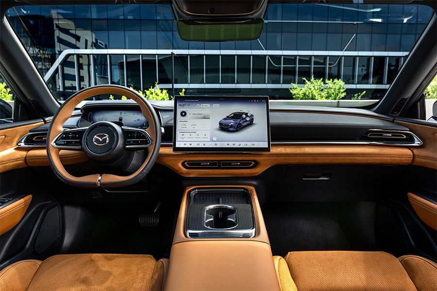 Much like its handsome exterior, the Mazda 6e’s cabin makes a strong first impression. Our test car is a high-spec variant and it greets you with swathes of tan suede and soft leather as you open the door (which is frameless for a welcome touch of glamour). The detailing is impressive, too, with diamond stitching on the seats and Mazda badging on the steering wheel and headrests.