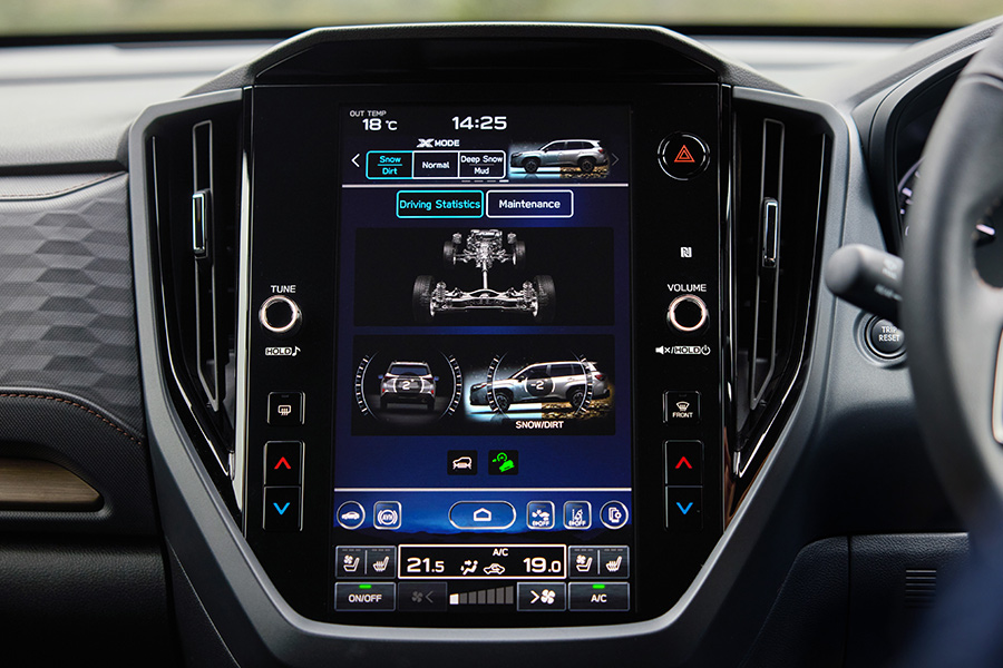 The 4.2-inch driver display screen, fitted to all petrol variants and base hybrid, is replaced by a full-size 12.3-inch digital cluster for Hybrid Sport and Hybrid Touring, showing additional information including maps and functions of Subaru’s EyeSight safety suite.