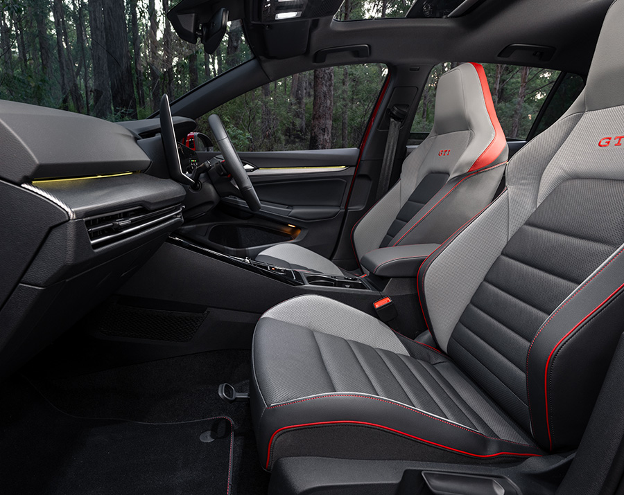 Moving to GTI gets buyers metallic paint, 19-inch alloys, tuneable chassis profiles, fog lights and GTI-specific bumper trims. A $3900 Leather Package adds Vienna leather upholstery, heating, ventilation, and electrical adjustment with memory to front seats, the 480W Harmon Kardon sound system and a head-up display.