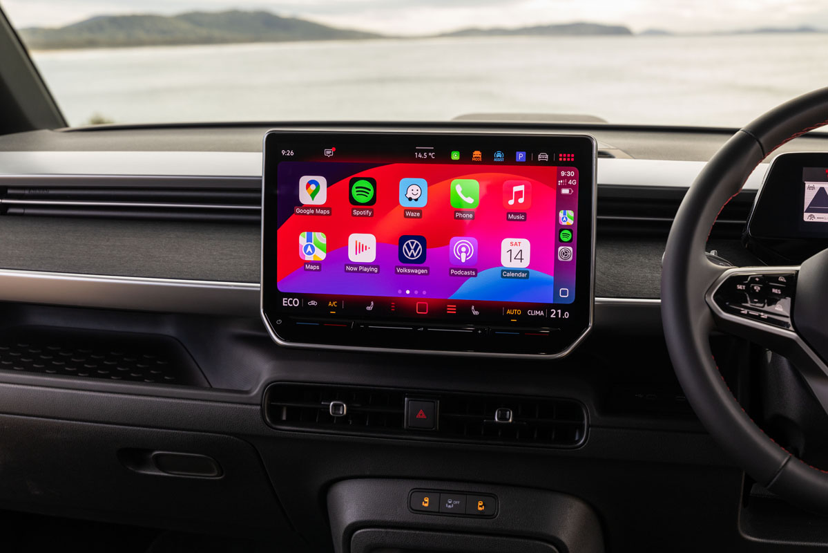 On the contrary, the 3.4-tonne ID. Buzz calmly accelerates to 100km/h, with light steering and near-silent cruising. Passengers in a passing Maserati (after I’d overtaken a B-double AusPost truck with the ease of an eagle on the wind) did a second take to check what they’d just witnessed.
