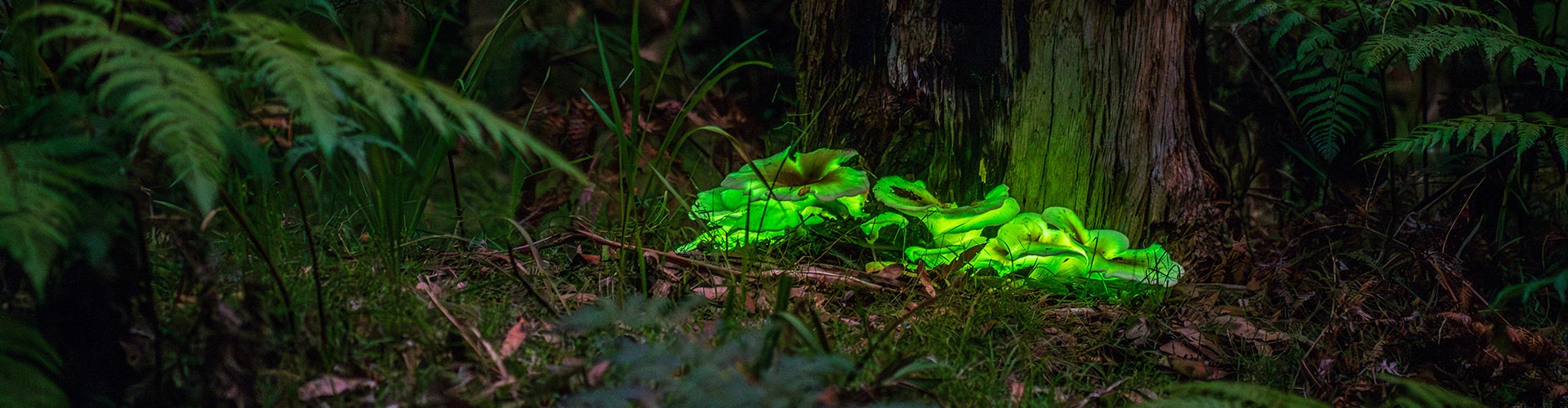 Ghost fungus or glow mushrooms are a particular type of mushroom that grows on rotting wood. Their formal name is Omphalotus nidiformis.
