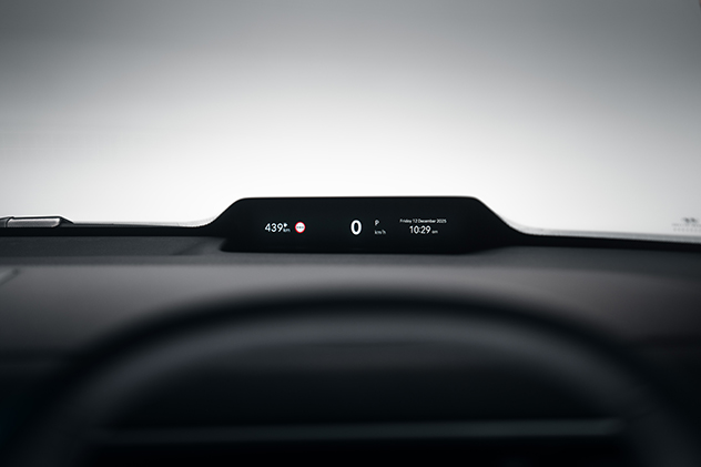 A head-up display is incorporated into the dash where it meets the windscreen, while the dashboard immediately in front of the driver is blank à la Tesla.
